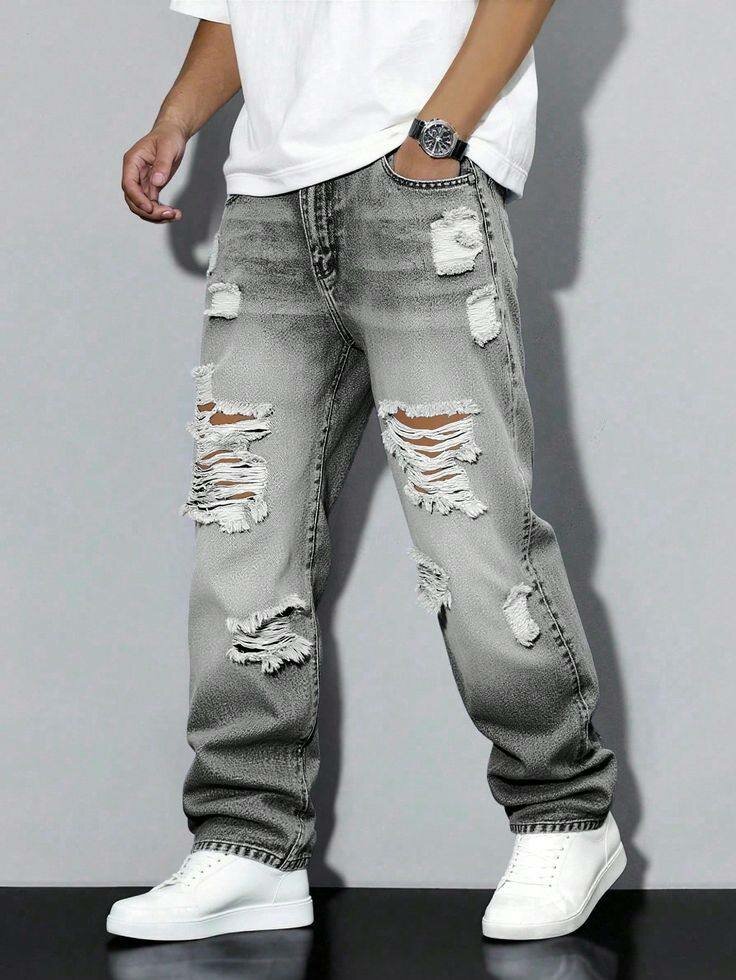 Jeans homme gris clair déchirés pour un style streetwear. Confortables et résistants, ils sont parfaits pour un look décontracté et tendance.