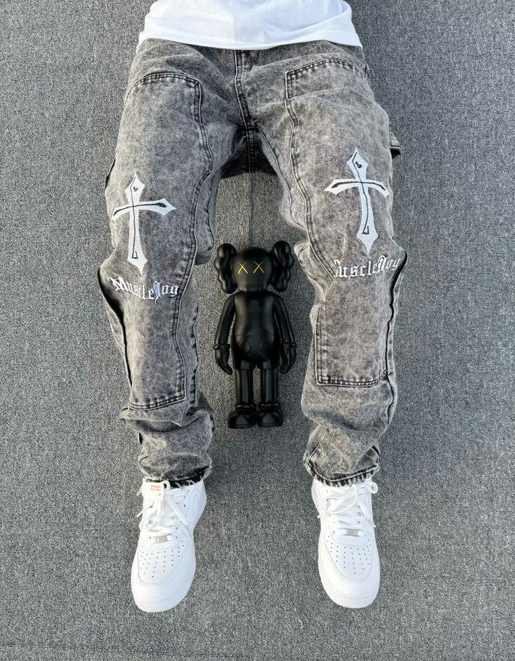 Jeans décontractés pour homme, style streetwear. Tissu denim résistant, coupe droite, motifs chrétiens