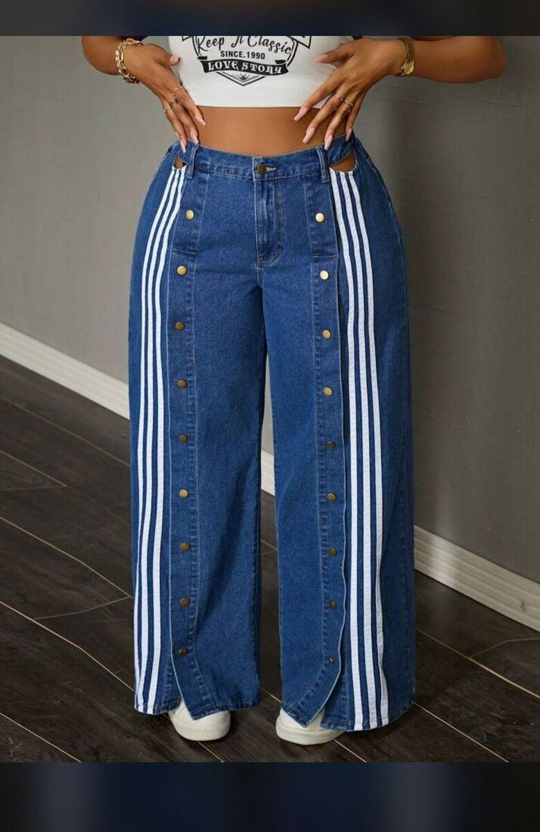 Découvrez ces jeans larges à rayures latérales, parfaits pour un style décontracté et tendance. Conçus pour mettre en valeur votre silhouette avec confort.
