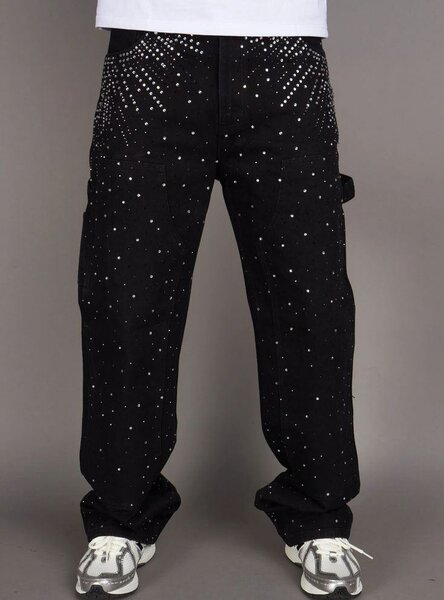 Des jeans larges noirs avec des motifs de croix strassés et détails brillants pour un look urbain et élégant. Idéal pour les amateurs de mode streetwear.