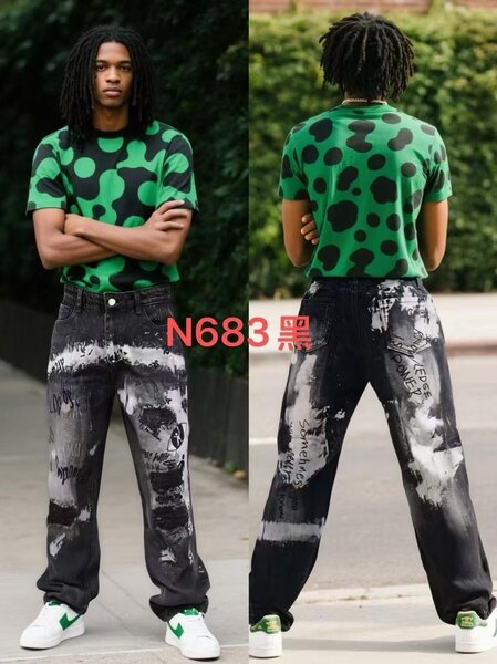 Découvrez ces jeans tendance avec motifs uniques et détails déchirés. Parfait pour un look urbain décontracté. Fabriqués avec des matériaux de haute qualité pour un confort optimal. Idéal pour les sorties ou un style quotidien.