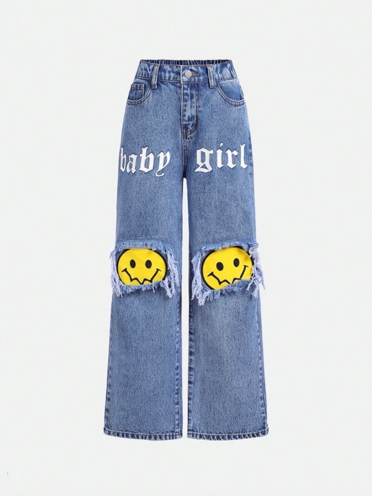 Teenage girls printed ripped straight jeans