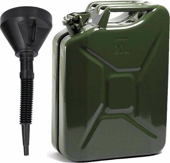 Robuste jerrican en métal de 20L avec entonnoir pratique. Idéal pour le stockage et le transport ... Résistant , parfait pour véhicules et outils motorisés. Un must pour les aventuriers et professionnels.