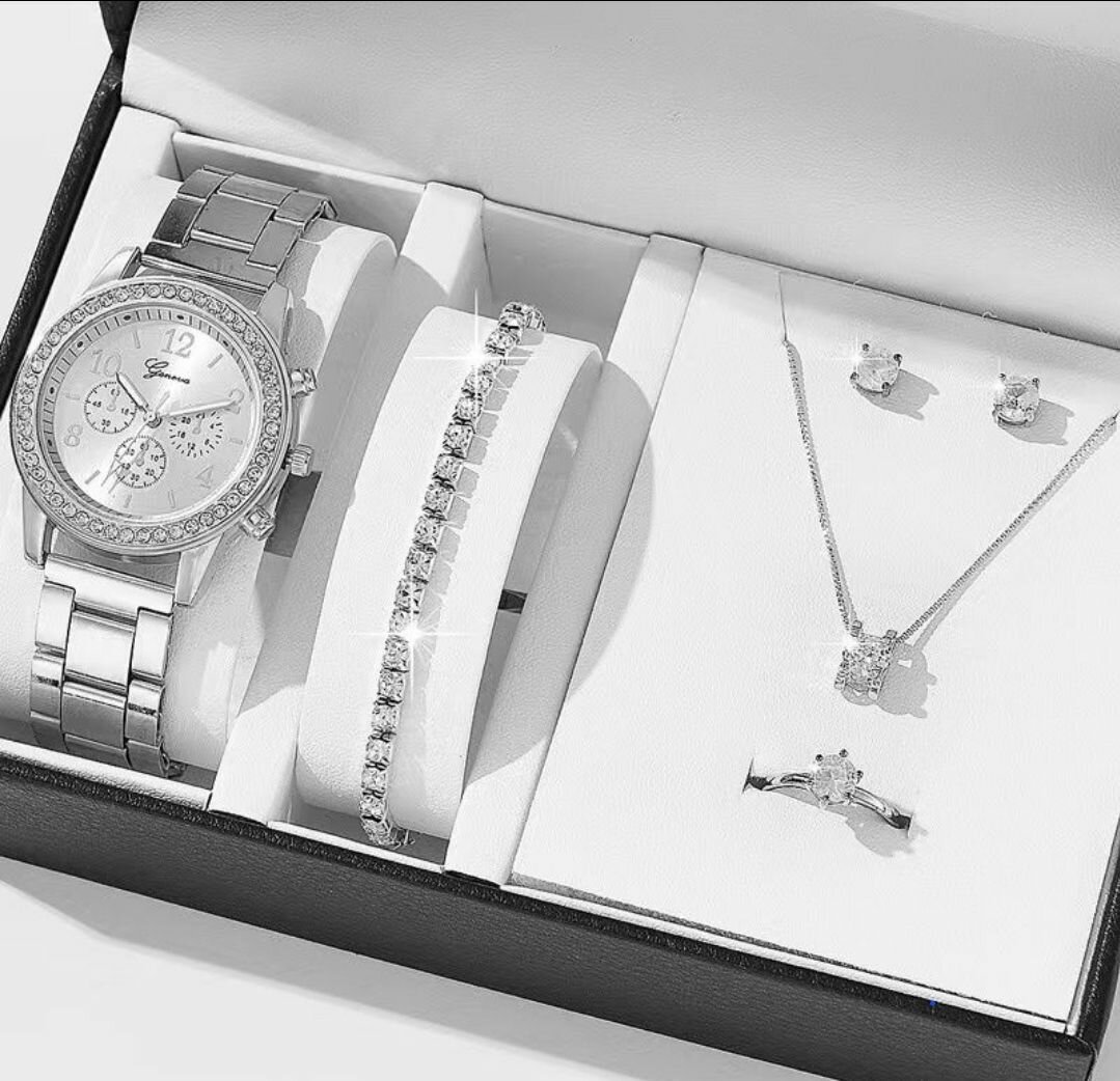 The watch, ring, necklace, and earrings are adorned with sparkling rhinestones, adding a touch of glamour to any outfit. Versatile fashion accessory set: This 5 piece set includes a watch, ring, necklace, and earrings, making it a versatile fashion accessory set that can be mixed and matched to suit any occasion. Quartz movement for accurate timekeeping: The watch features a reliable quartz movement, ensuring accurate timekeeping and making it a practical choice for everyday wear. Durable alloy