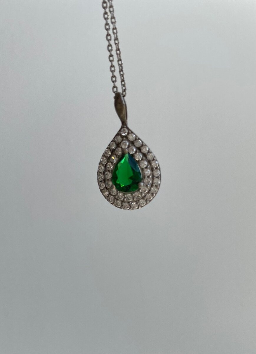 Кулон из зеленого граната в обрамлении фионита на серебряной цепочке. Совершенно новый, в коробочке.