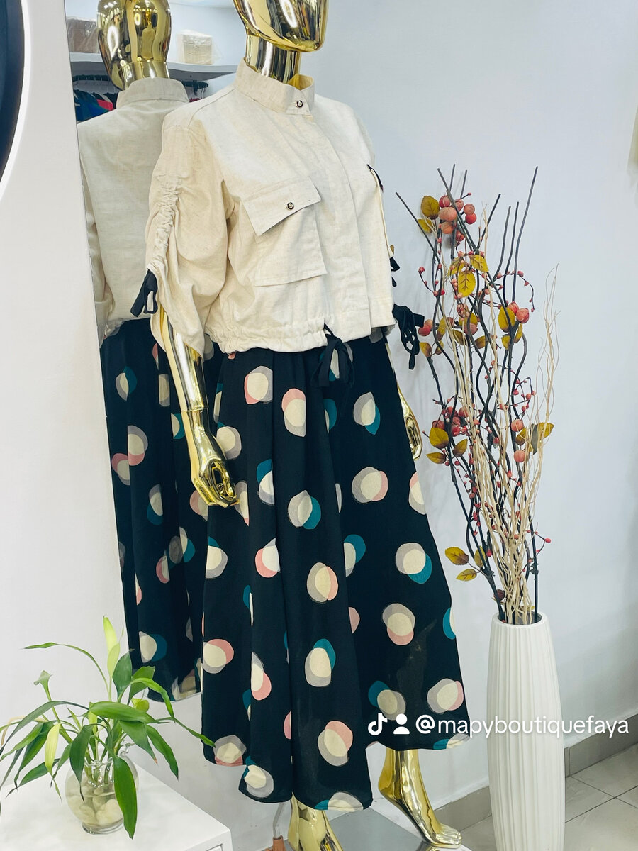 Découvrez cette élégante jupe à pois colorés, parfaite pour un look tendance et décontracté. Associée à une veste stylée à manches froncées, elle est idéale pour les journées printanières. Style unique et confort assuré!