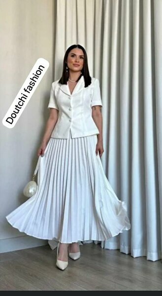 Jupe plissée blanche élégante, coupe longue, parfaite pour un look élégant ou cérémonies. S’accorde avec toute veste ou blouse claire.