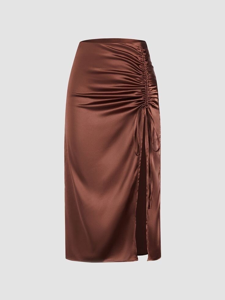 Découvrez cette jupe satinée marron avec fente et fronces, idéale pour des soirées chics. Sa coupe longue et raffinée en fait un choix parfait pour se démarquer avec élégance. Associez-la avec un haut simple pour un look glamour.