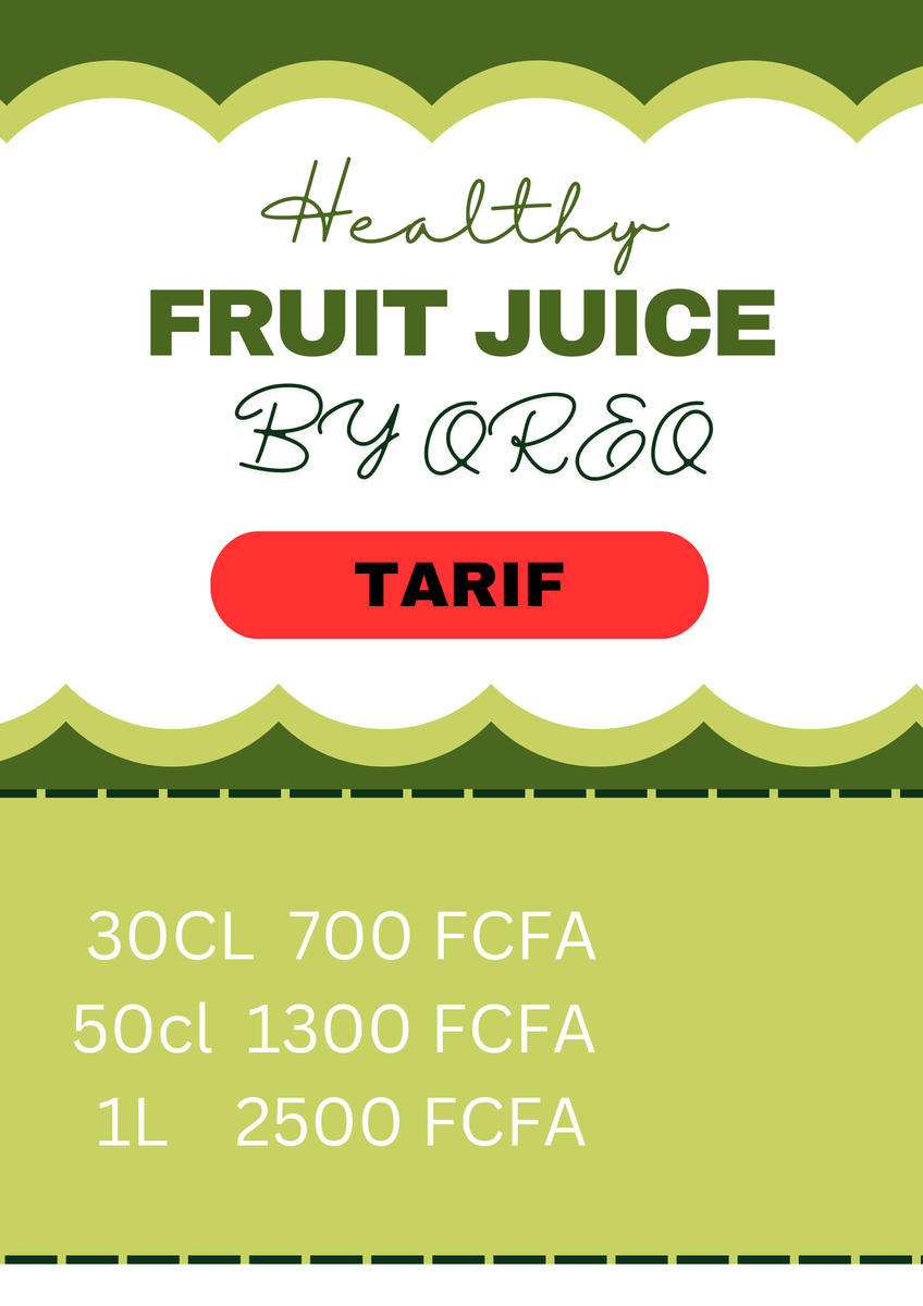 Découvrez notre jus de fruits sain par QREQ, une boisson rafraîchissante et nutritive. Disponible en 30cl, 50cl et 1L pour s'adapter à toutes vos envies. Parfait pour commencer la journée ou pour une pause gourmande. Profitez d'une saveur 100% naturelle qui ravira vos papilles tout en boostant votre énergie.