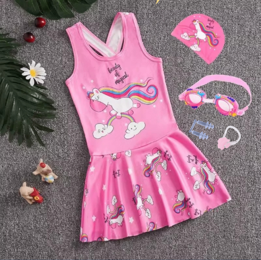 This swimsuit set is unique as it the dress comes with shorts underneath together with the following accessories; a swim cap, a pair of goggles, a nose clip and a pair of earplugs. Suitable for ages 1-4years