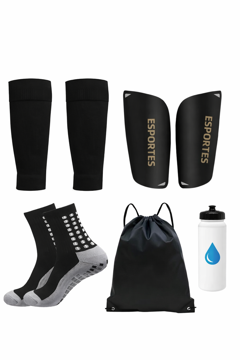 Ensemble complet de protection pour le football, comprenant protège-tibias, manchons, chaussettes antidérapantes, gourde et sac de rangement. Idéal pour les entraînements et matchs, ce kit assure confort et sécurité sur le terrain.