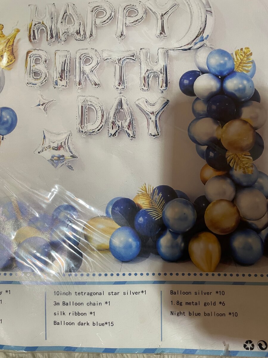 Kit décoration anniversaire comprenant des ballons en bleu nuit, argent et or métallisé. Inclut une guirlande et une inscription 'Happy Birthday' en lettres métalliques. Idéal pour une fête d'anniversaire élégante et festive.