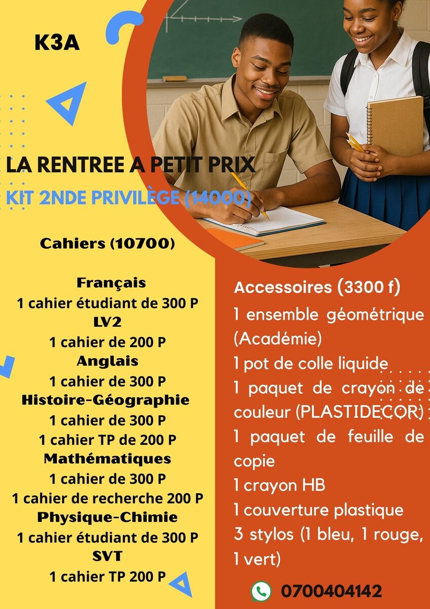 Kit complet de fournitures pour élèves de seconde. Comprend cahiers variés, accessoires géométriques et outils essentiels pour une rentrée réussie. Idéal pour l'organisation et la productivité scolaire.