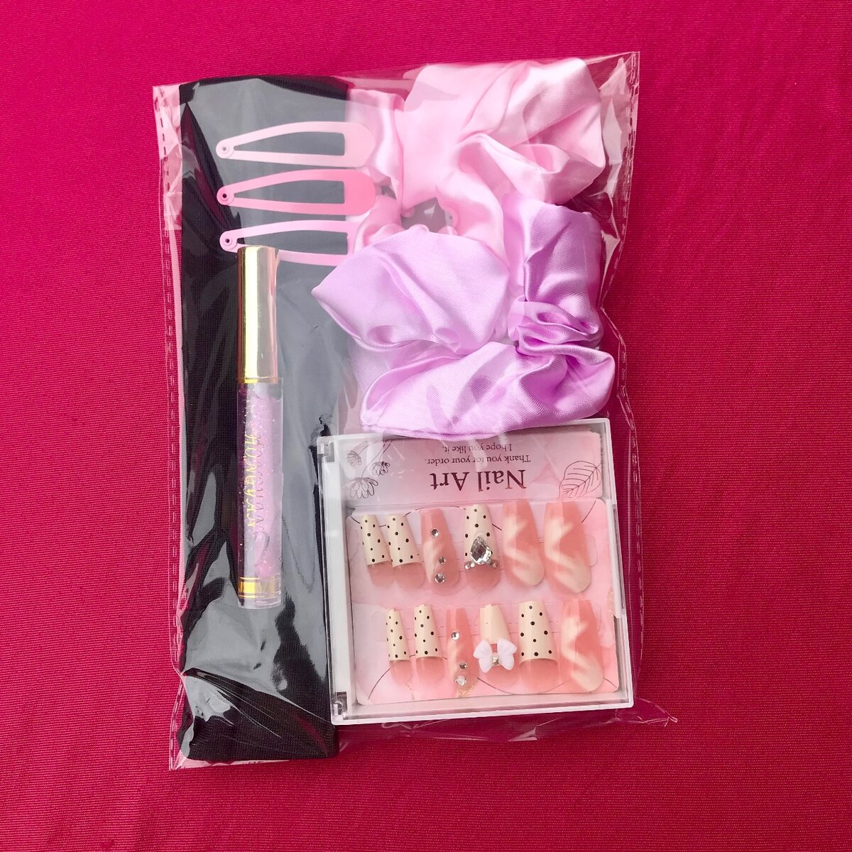 Améliorez votre style avec ce kit beauté complet comprenant des faux ongles élégants, un gloss scintillant, des chouchous en satin et des accessoires pour cheveux. Parfait pour des occasions spéciales ou une mise en beauté quotidienne, ce set est un incontournable pour ajouter une touche glamour à votre look.