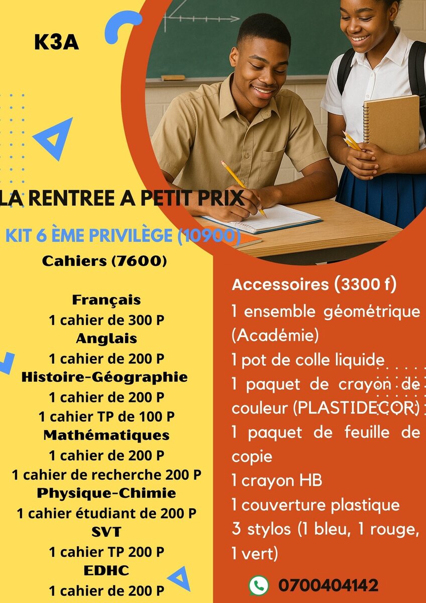 Découvrez notre kit scolaire complet pour les élèves de 6ème, comprenant cahiers, accessoires mathématiques, outils d'écriture et plus. Idéal pour une rentrée organisée et sans stress. Profitez d'une qualité exceptionnelle à petit prix!
