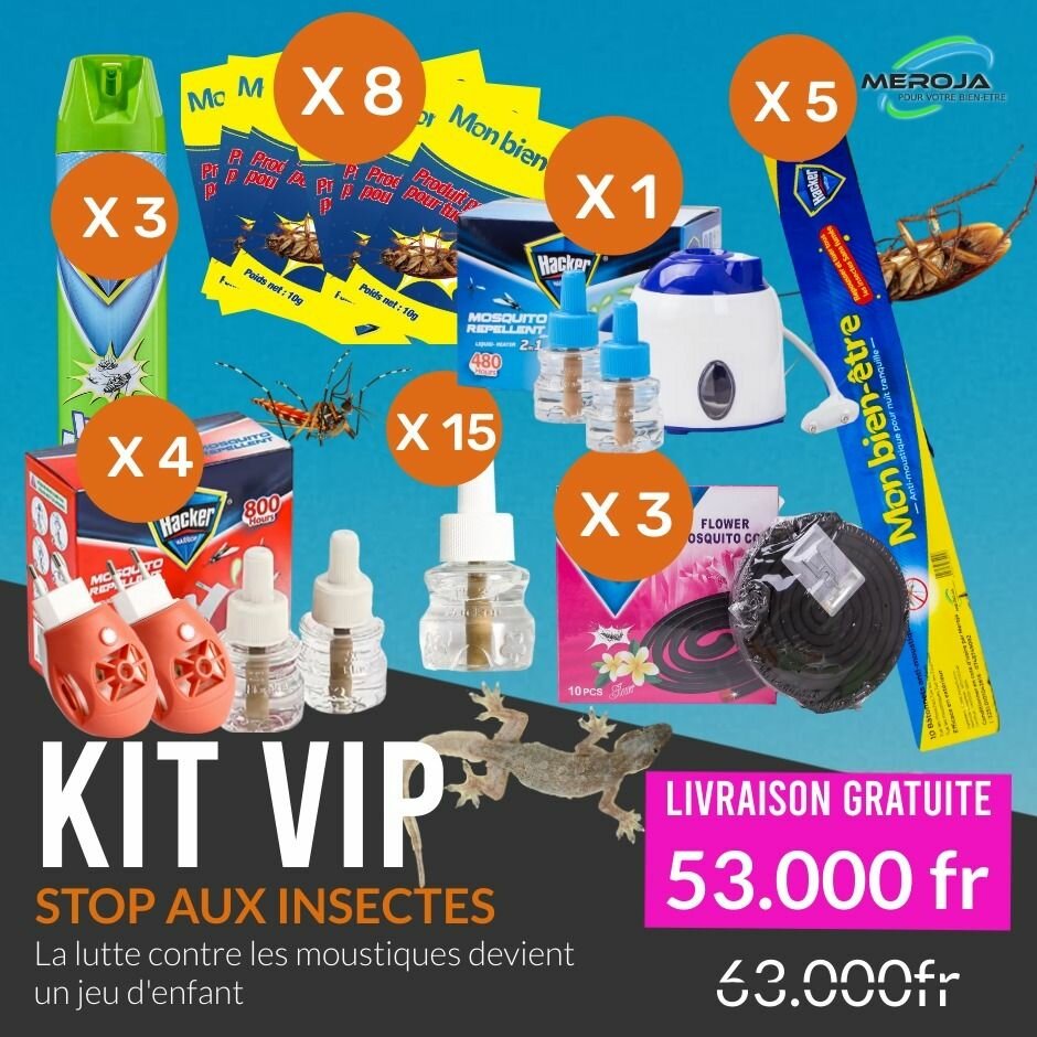 4 X KIT DUO (2 appareil + 2 recharges) 3 X VAPORISATEUR HACKER 8 X ANTI CAFARD (10 grammes) 5 X ENCENS (10 brindilles) 1 X KIT APOUTCHOU (1 appareil + 2 recharges) 15 X RECHARGES 3 X SPIRALS