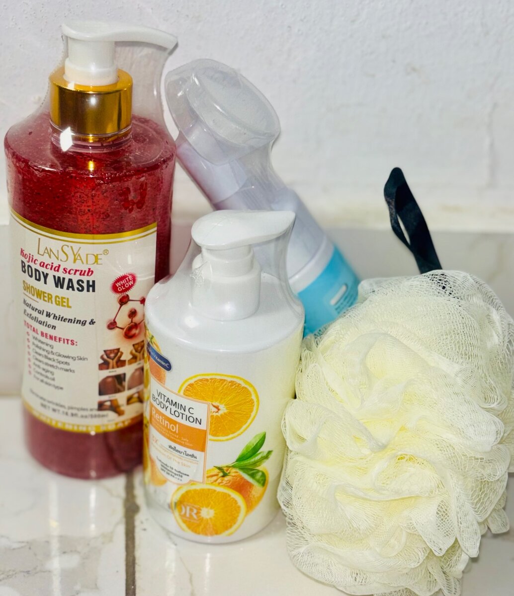 Savon de corps , lait de corps , mousse nettoyante, éponge de corps