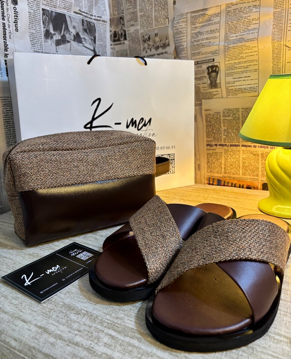 Duo pour homme composé d une paire de sandale en cuir et d´une pochette assortie en cuir