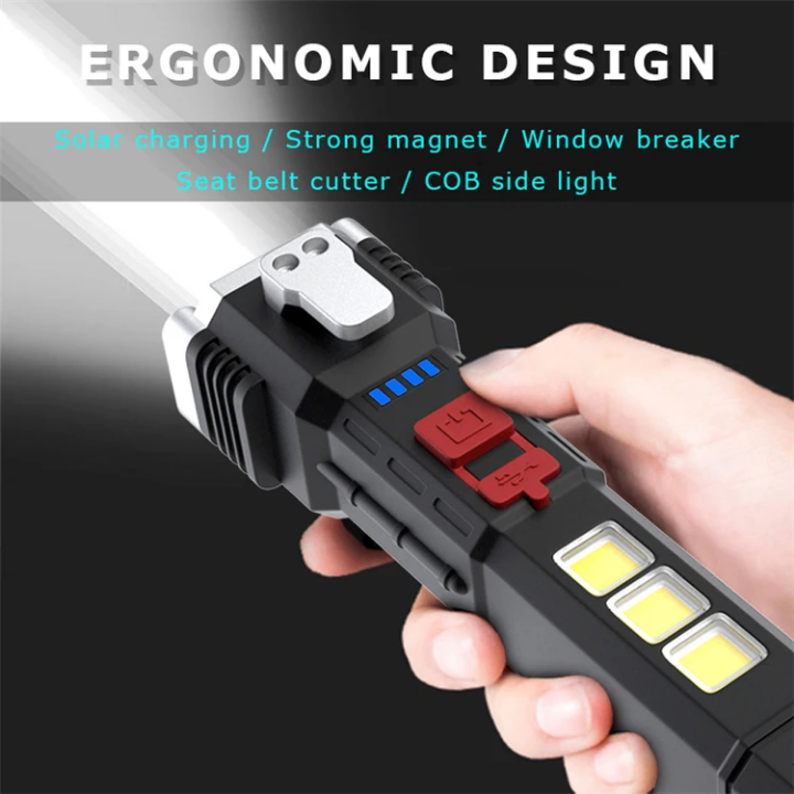 Découvrez la lampe de poche tactique solaire, idéale pour les situations d'urgence. Avec sa charge solaire, coupe-ceinture, brise-vitre et lumière latérale COB, elle est parfaite pour la voiture ou les activités extérieures. Un choix sûr et intelligent!