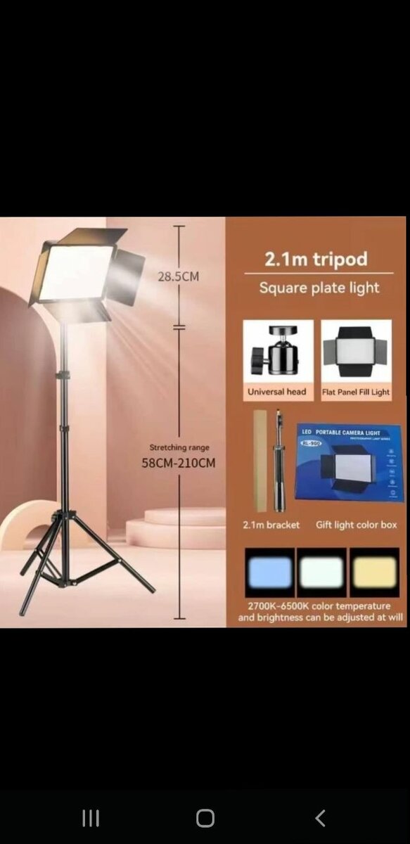 Éclairage professionnel pour photographie avec trépied robuste, tête universelle et boîte de couleurs. Réglable en hauteur (58-210 cm), température de couleur 2700K-6500K. Idéal pour les photographes amateurs ou professionnels.