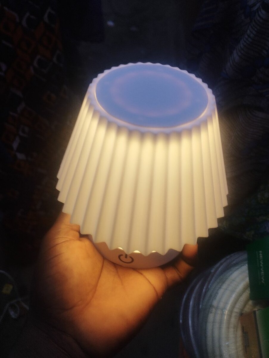 Élégante lampe de table LED avec un design plissé et un pied en métal. Parfaite pour l'éclairage d'ambiance dans le salon ou la chambre.
