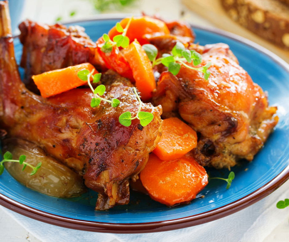 Découvrez notre plat de lapin 1 gros morceau, cuit au four bien assaisonné, servi avec une portion de riz.
