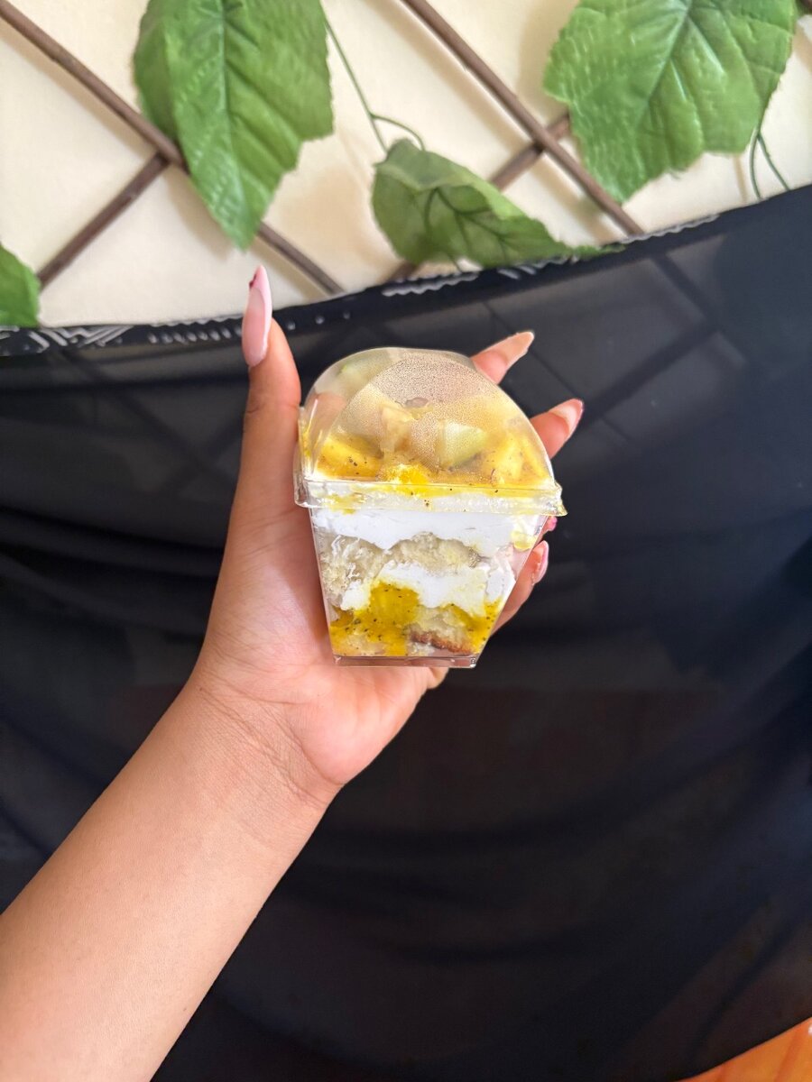 ce délicieux layer cup exotique, garni de fruits tropicaux (passion et ananas ) avec un coulis de passion et morceau d´ananas et une chantilly légère