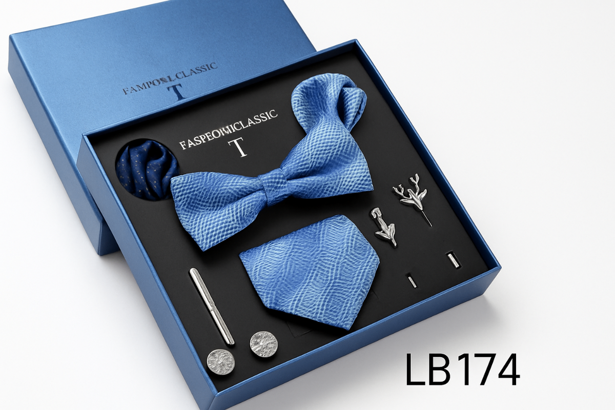Apportez une touche de raffinement à votre tenue avec cet élégant set de nœud papillon bleu. Comprend un nœud papillon, une pochette, une broche et des boutons de manchette assortis. Idéal pour les événements formels et les mariages.