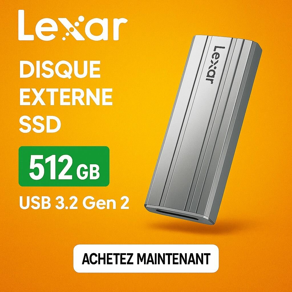 Améliorez vos performances avec le disque SSD externe Lexar de 512GB. Doté de la technologie USB 3.2 Gen 2 pour des transferts ultrarapides, ce SSD est idéal pour vos voyages ou votre bureau.