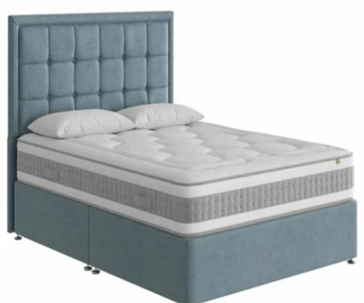 Lit confortable avec tête de lit capitonnée et matelas orthopédique inclus. Design élégant et moderne pour une chambre à coucher cosy. Structure robuste avec rangement sous le lit.