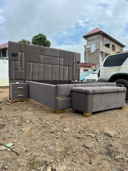 Lit gris capitonné avec rangement