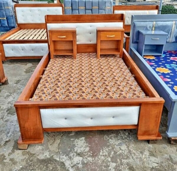 Lit moderne avec tête de lit et rangements intégrés. Design élégant en bois et blanc. Espace de rangement sous le lit et tiroirs latéraux.