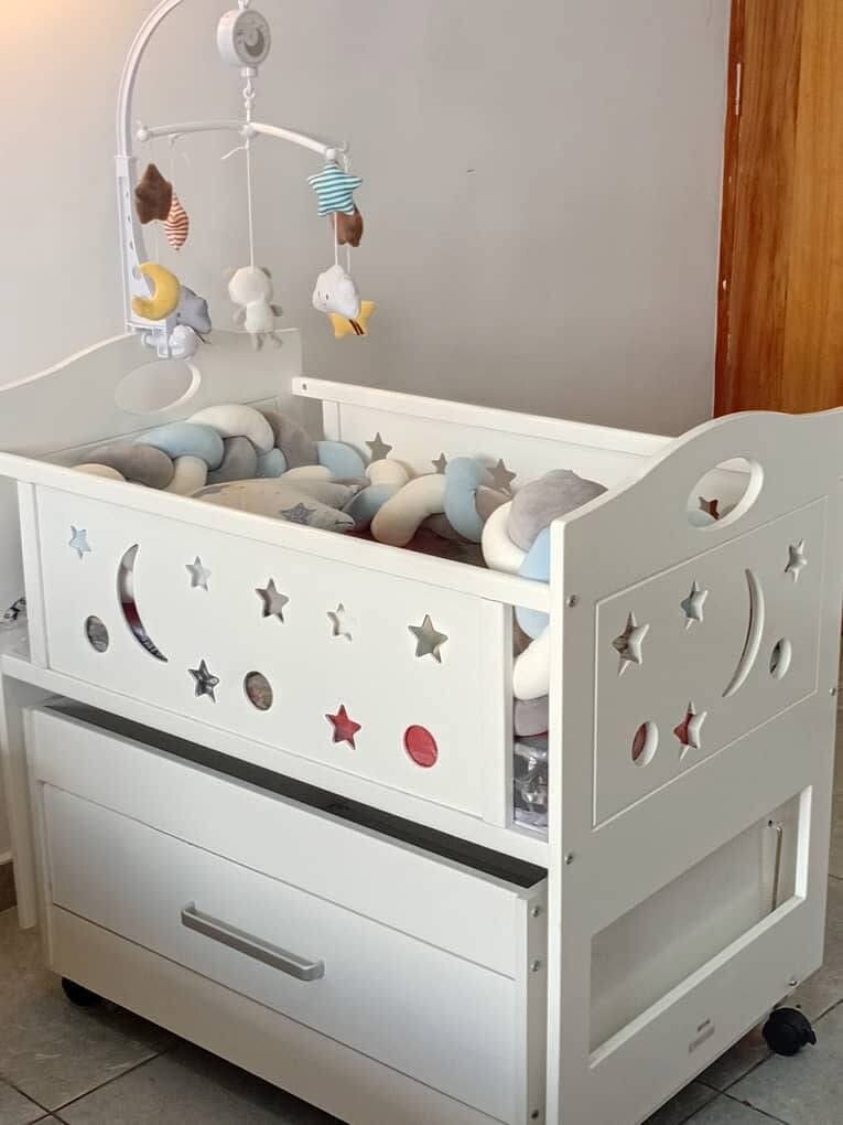 Lit bébé évolutif en blanc avec tiroir de rangement. Design avec motifs étoiles et lune. Sécurisé et pratique pour l'enfant et les parents. Parfait pour la chambre de bébé.