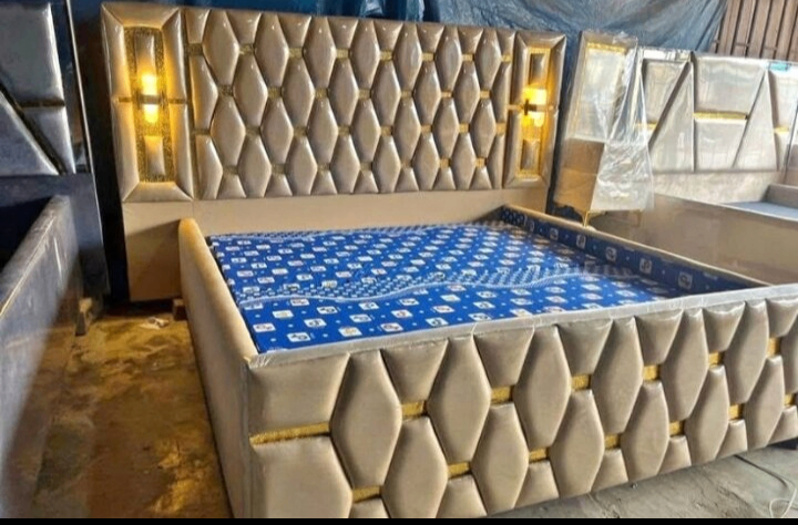 Lit adulte capitonné avec tête de lit et éclairage intégré. Design luxueux et confortable, parfait pour une chambre moderne.