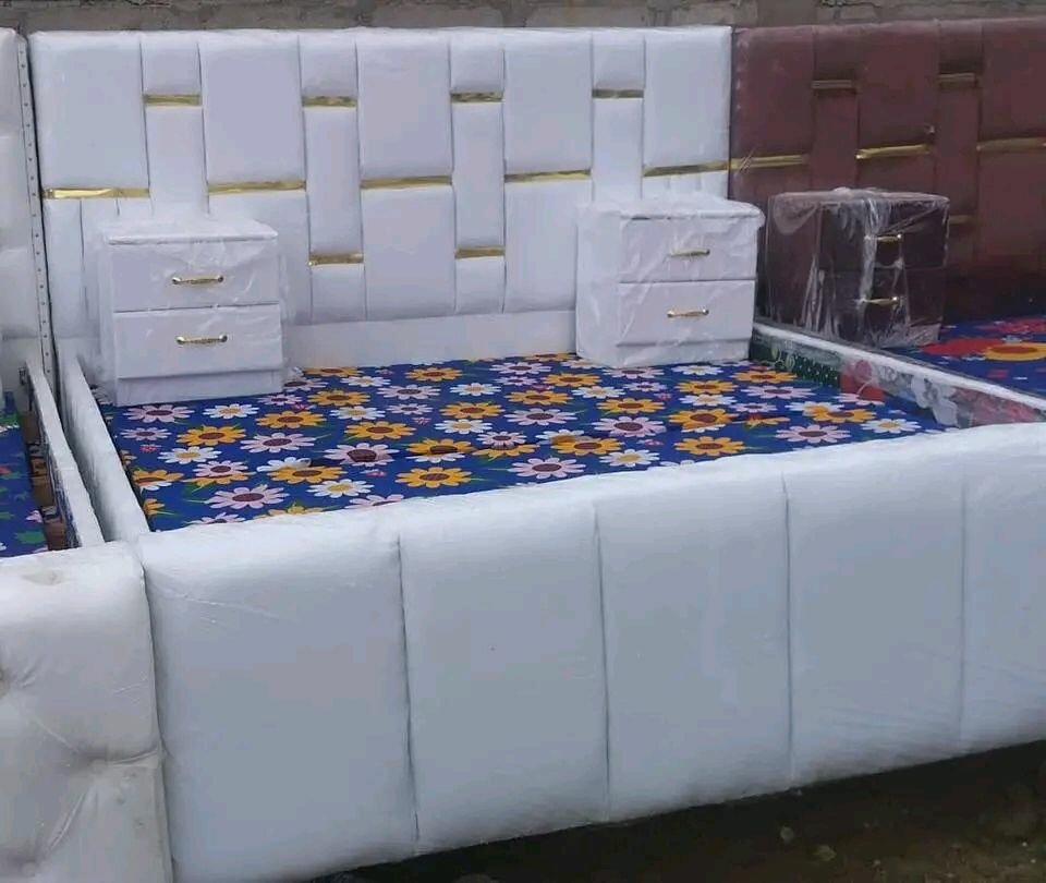 Lit moderne en cuir blanc avec tête de lit et chevets capitonnés. Design élégant et confortable, idéal pour une chambre à coucher contemporaine.