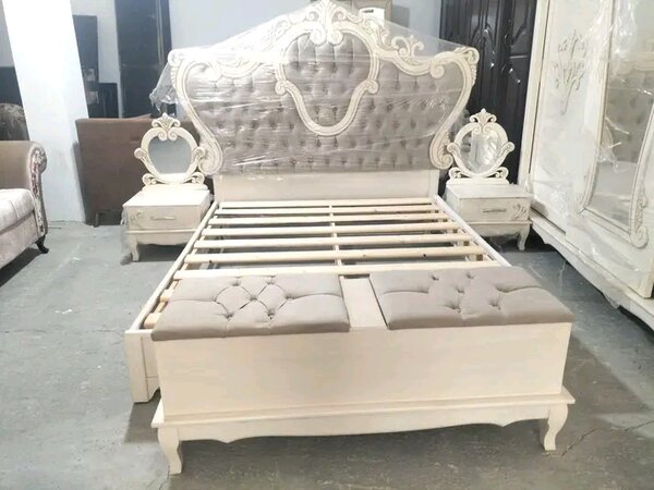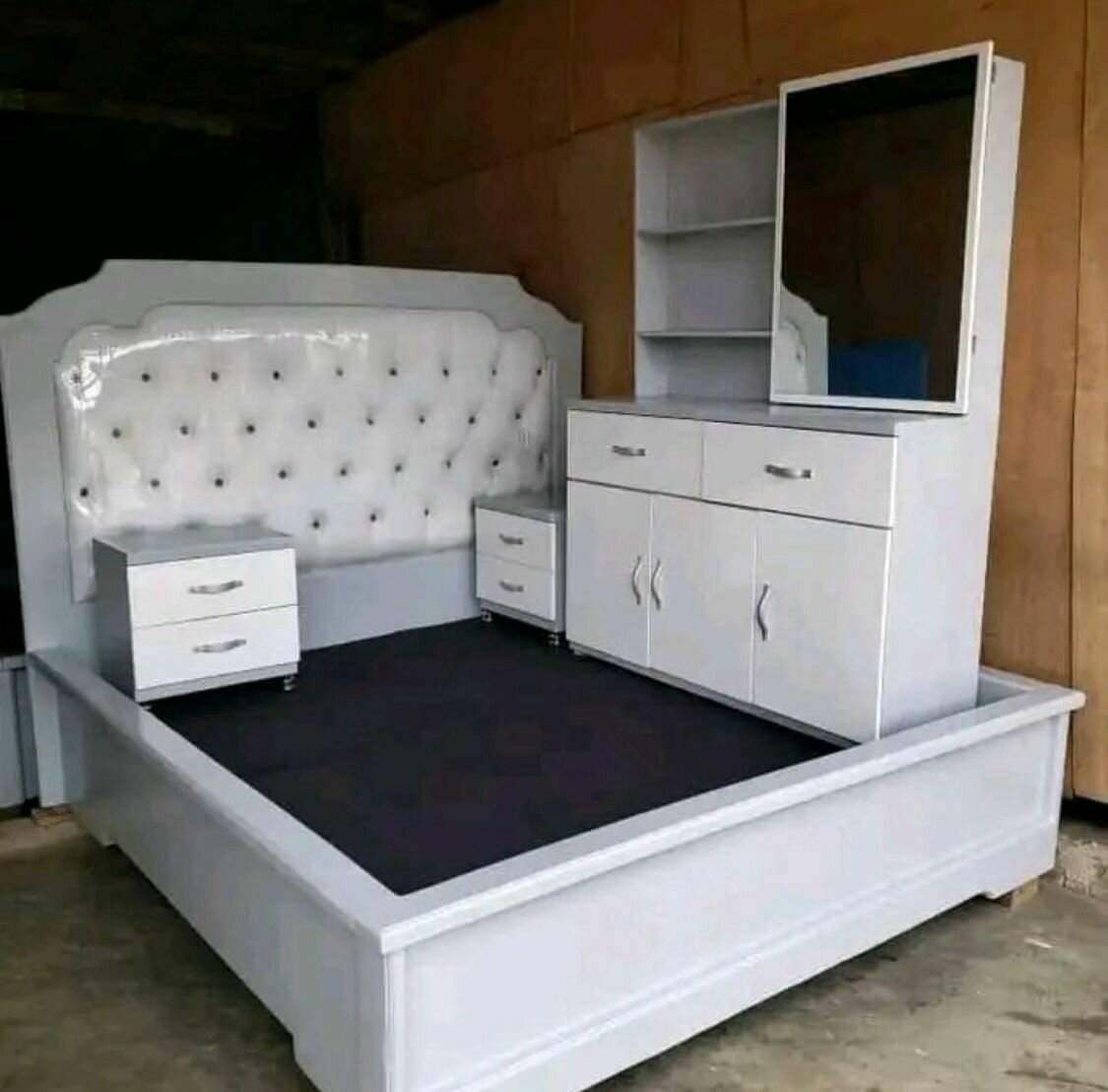 Ensemble lit moderne avec tête de lit capitonnée, commode et miroir. Conçu pour un confort et une fonctionnalité optimaux. Parfait pour une chambre élégante et organisée.