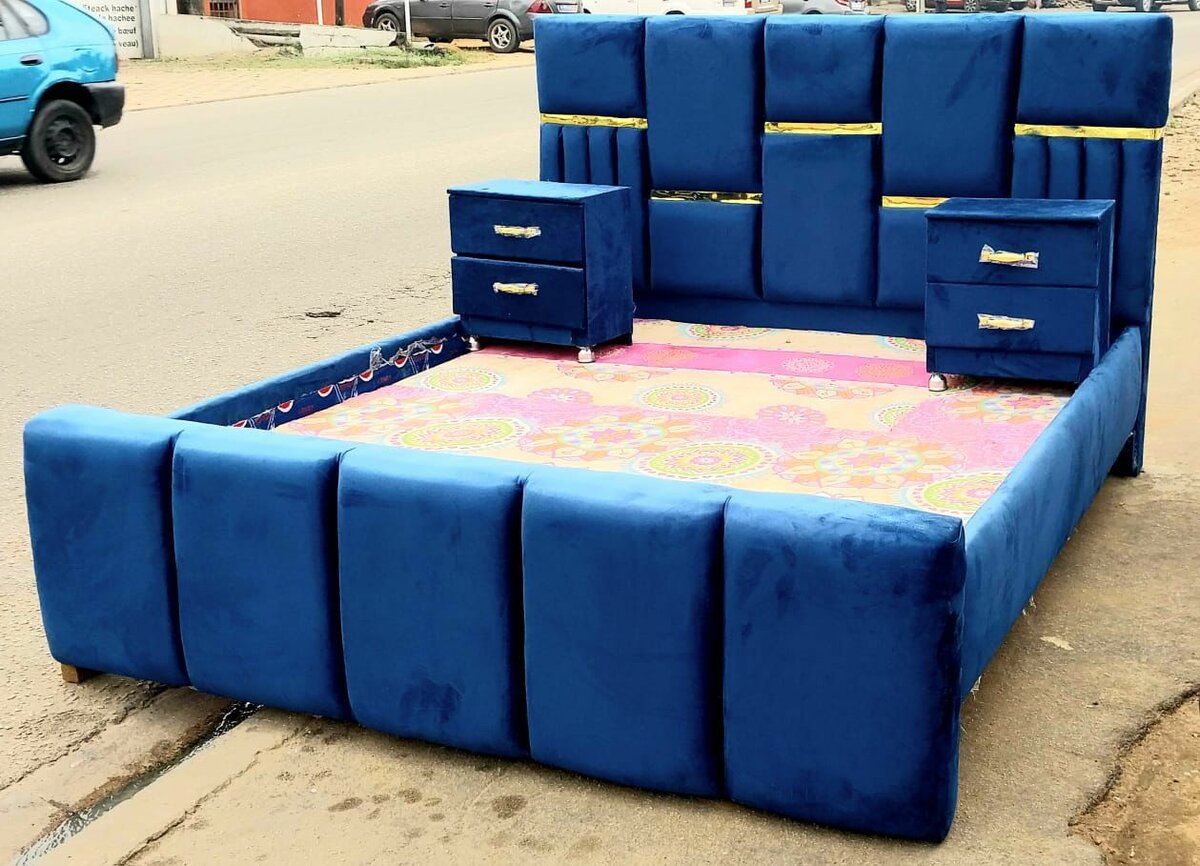 Ensemble lit et chevets en velours bleu. Confort et élégance pour votre chambre avec un design moderne et des finitions soignées. Idéal pour un espace cosy.