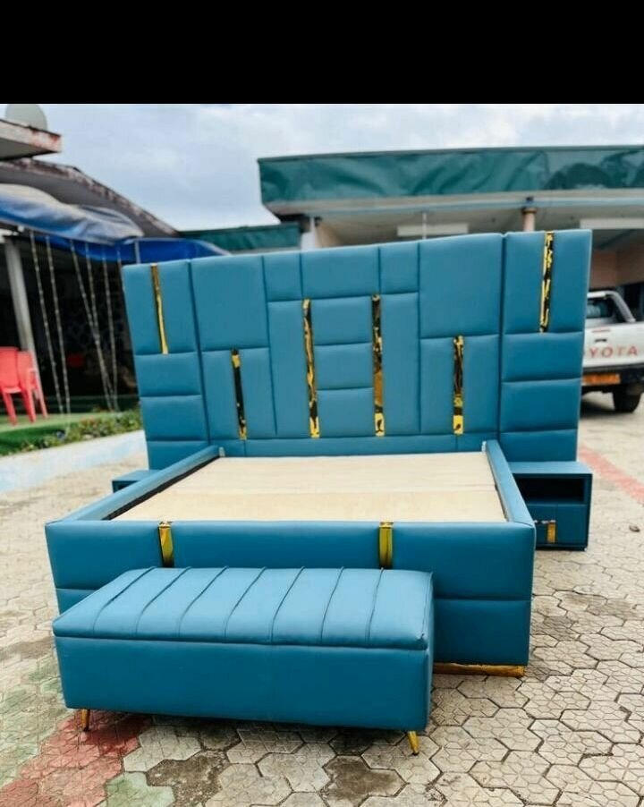 Lit design avec coffre intégré et rangements latéraux. Conçu pour un confort optimal et un espace de stockage supplémentaire. Tête de lit capitonnée avec détails dorés.
