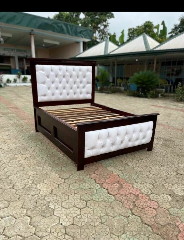 Lit en bois avec tête de lit capitonnée et rangement intégré. Design élégant et robuste pour une chambre confortable.