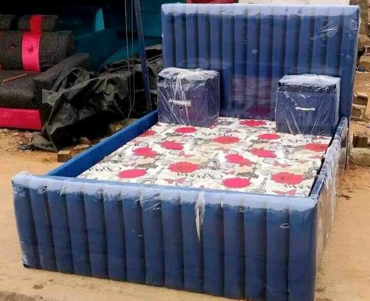 Découvrez ce lit double spacieux équipé de chevets intégrés, revêtu de cuir bleu robuste. Offre un confort optimal avec son matelas inclus. Idéal pour une chambre moderne et élégante.