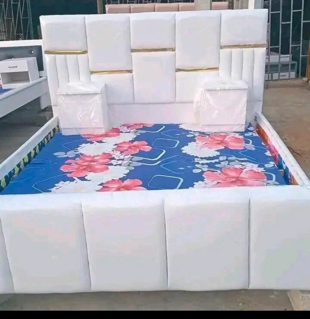 Lit double capitonné en cuir synthétique blanc avec matelas floral. Design luxueux et confortable, idéal pour une chambre moderne. Facile à assembler et durable.