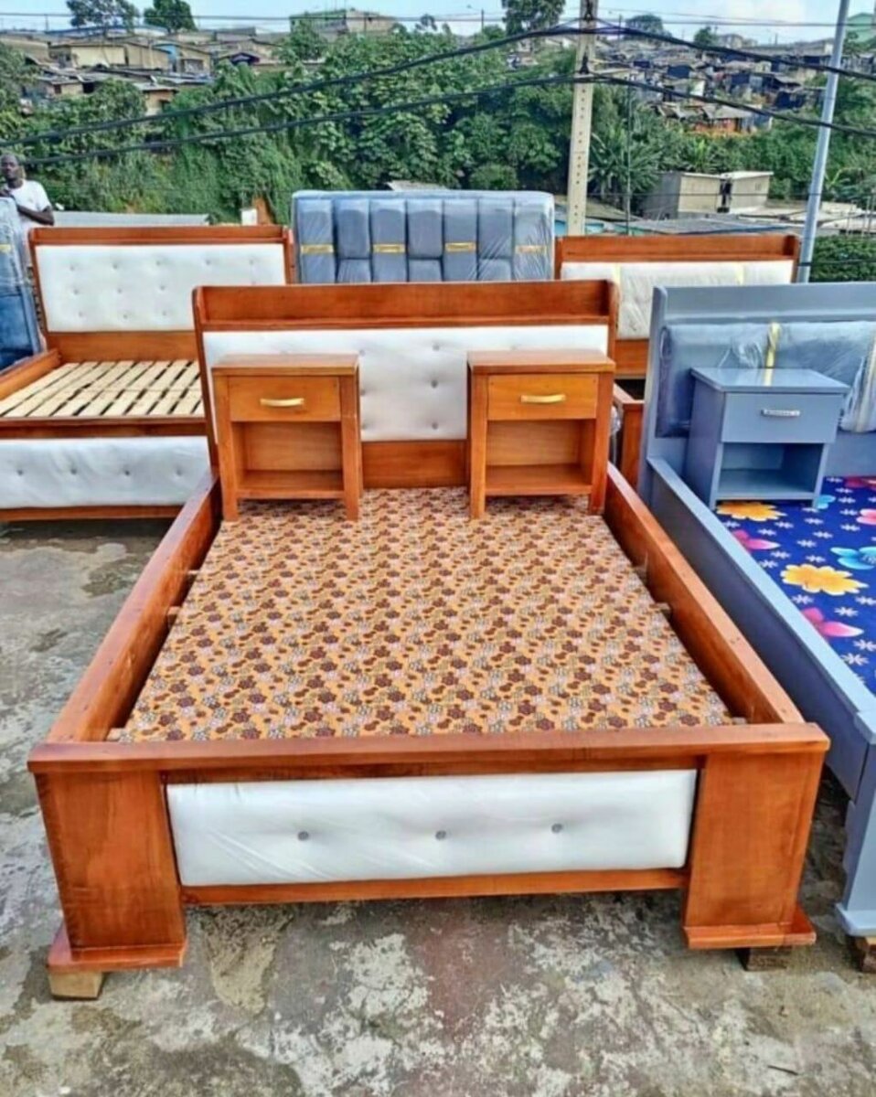 Lit double en bois avec tête de lit capitonnée et tables de chevet intégrées. Conçu pour un confort optimal et un style élégant. Parfait pour les chambres modernes.