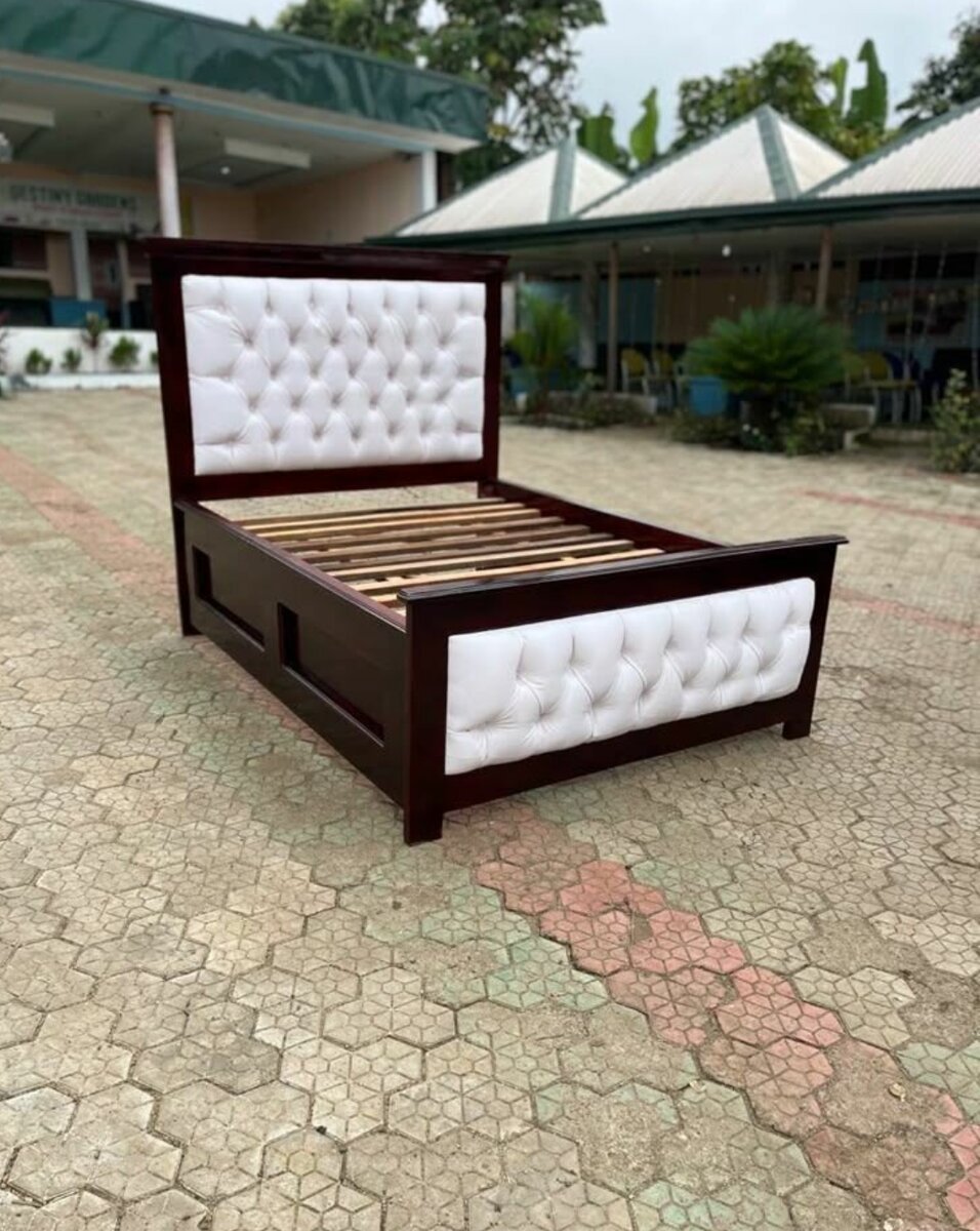 Lit double en bois massif avec tête de lit et pieds capitonnés. Conçu pour un confort optimal, ce lit est idéal pour une chambre à coucher moderne.