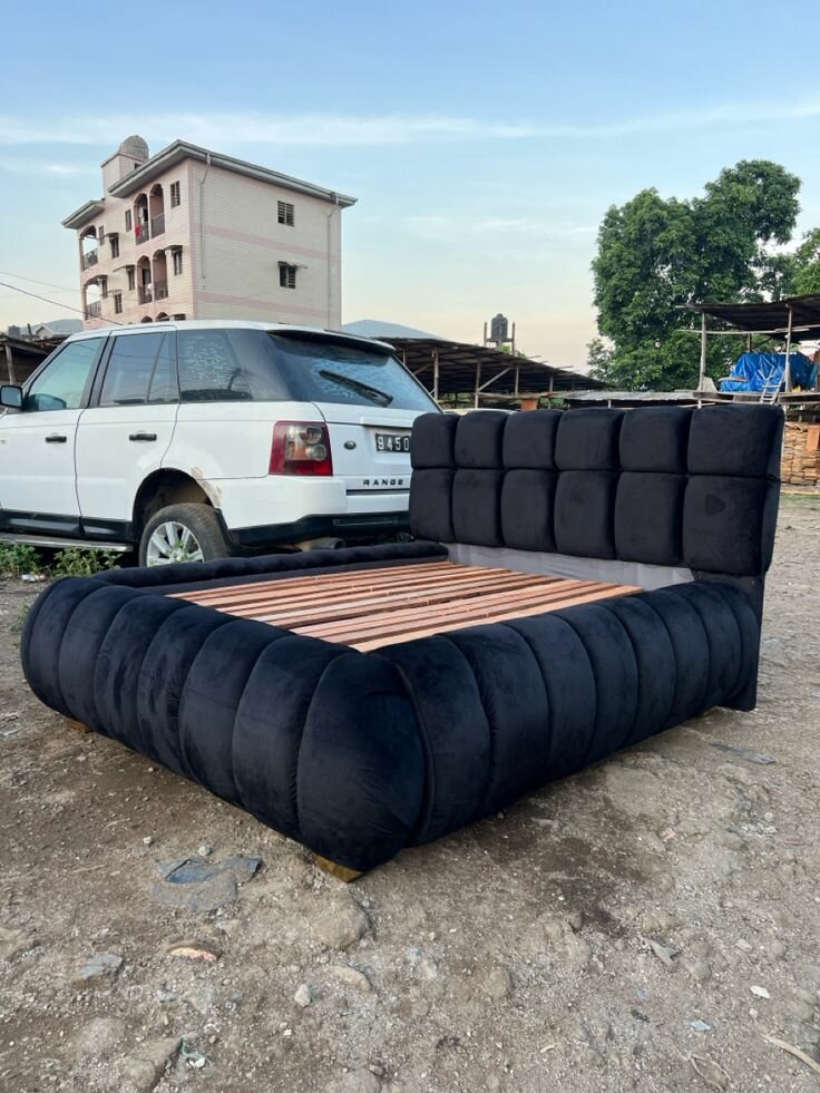 Lit contemporain en velours noir avec structure robuste et design élégant. Parfait pour une chambre moderne, il offre un confort optimal et un style raffiné.
