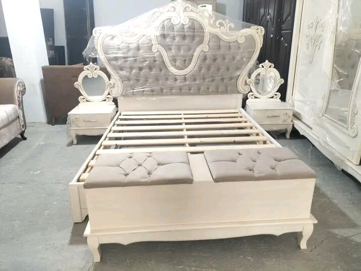 Découvrez l'élégance de ce lit double avec sa tête de lit capitonnée sophistiquée. Parfait pour transformer votre chambre en un espace luxueux, il est accompagné de deux tables de chevet assorties et d'un banc de pied-de-lit pratique. Dimensions généreuses, idéal pour un confort optimal.