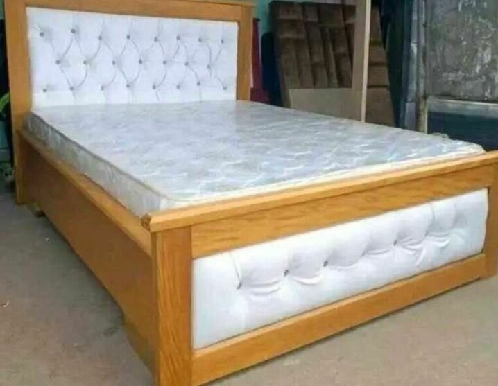 Lit en bois avec matelas et tête de lit capitonnée