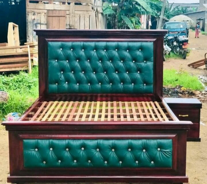 Lit en bois massif avec tête de lit et pied de lit capitonnés en cuir vert. Design élégant et confortable, idéal pour une chambre à coucher moderne.