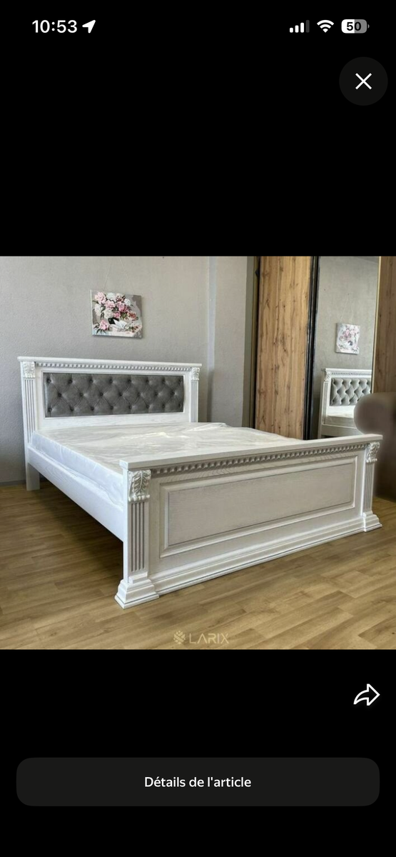 Lit élégant avec tête de lit capitonnée en tissu gris et cadre en bois blanc. Design classique pour une chambre moderne. Parfait pour un sommeil confortable et une décoration raffinée.