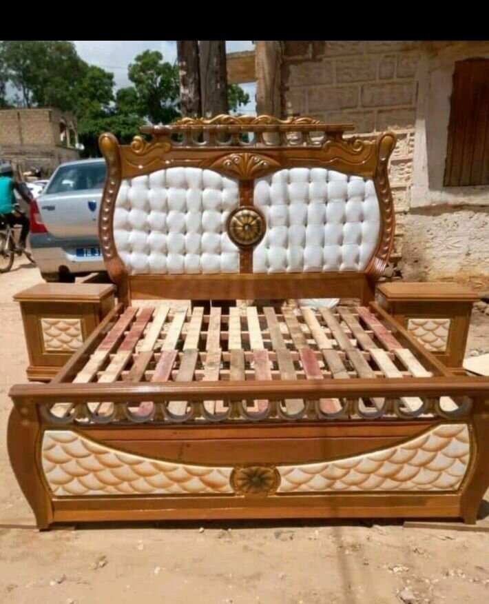 Lit en bois sculpté avec tête de lit capitonnée, idéal pour une chambre à coucher élégante. Fabriqué en bois massif avec des motifs sculptés et des détails dorés. Tête de lit capitonnée pour un confort optimal. Convient pour une chambre parentale ou une suite luxueuse.