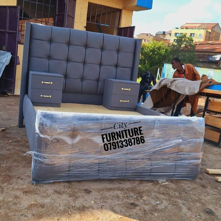 Lit contemporain avec tête de lit capitonnée et chevets intégrés. Conception robuste et tissu de haute qualité. Idéal pour une chambre moderne et élégante.